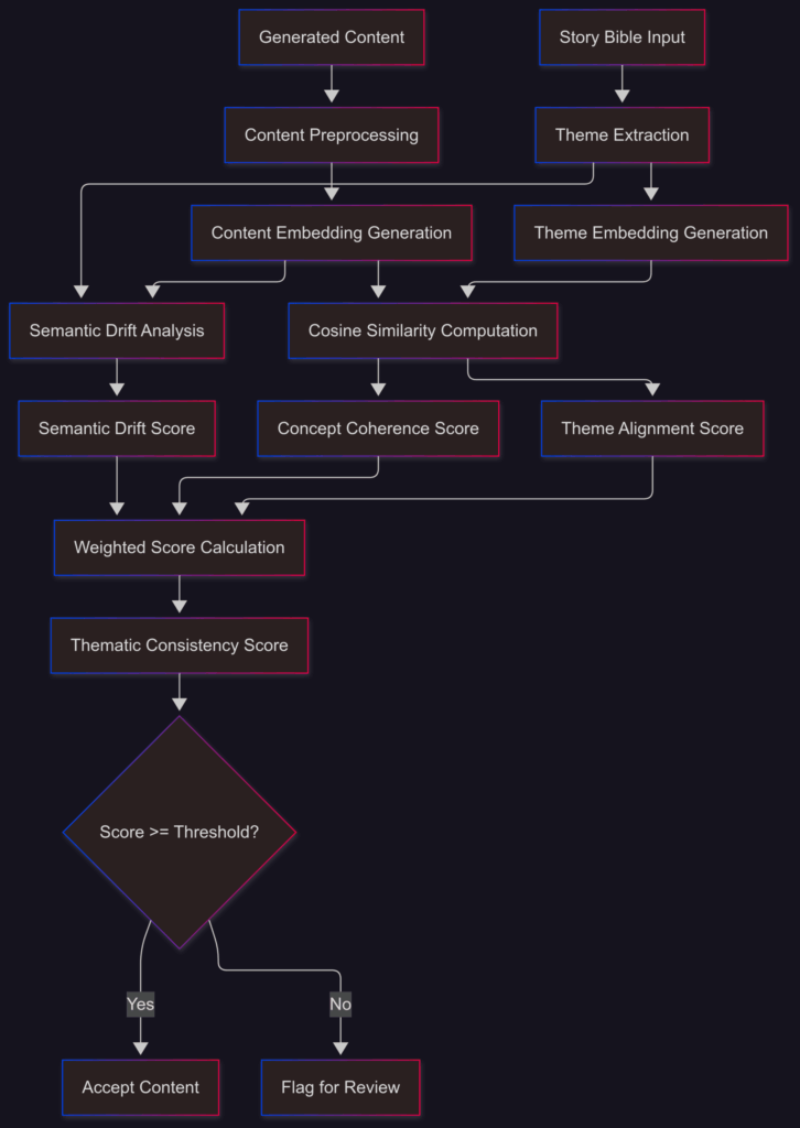Methodology: The system employs pre-trained sentence transformers to encode narrative segments into high-dimensional vector representations. The analyser computes semantic similarity between generated content and the original manuscript’s thematic elements using cosine similarity measures.