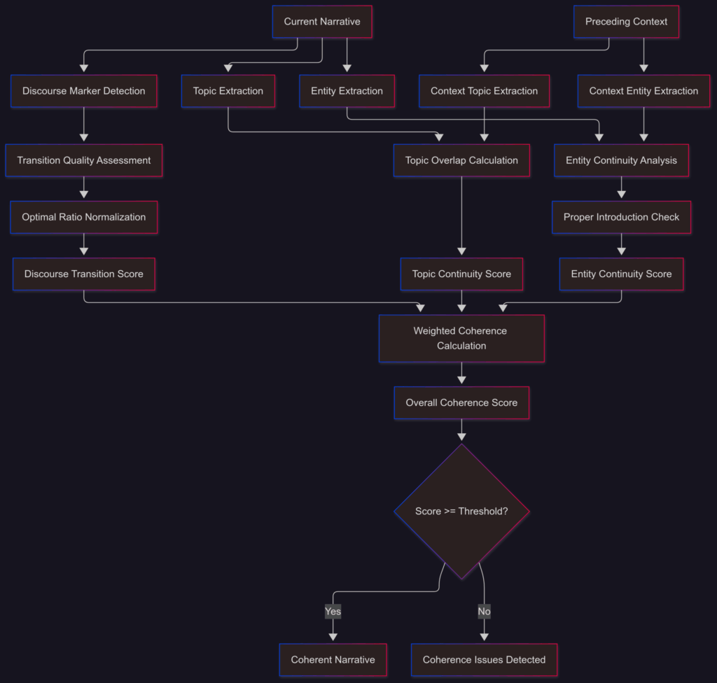 - Narrative Flow Scoring: Quantitative assessment of logical progression with optimal transition ratio of 30%
