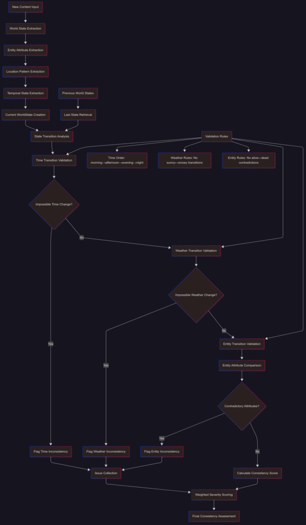 Technical Implementation: Multi-modal analysis system for identifying logically impossible narrative transitions in world state, character development, and plot progression.
